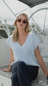 Striking yet understated, the Dockside Vest is defined by its unique negative stripe design—an eye-catching visual effect created through spaced rib stitching and the clever interplay of two-tone yarns. The result is a flattering, sculptural look that enhances the body without overwhelming it. Crafted in pure cotton yarn for a breathable, soft, natural feel against the body. Its simplicity is its strength - refined styling details include a subtly feminine heart-shaped V-neckline and neat cap sleeves, offering just the right amount of coverage while maintaining a clean, modern silhouette.